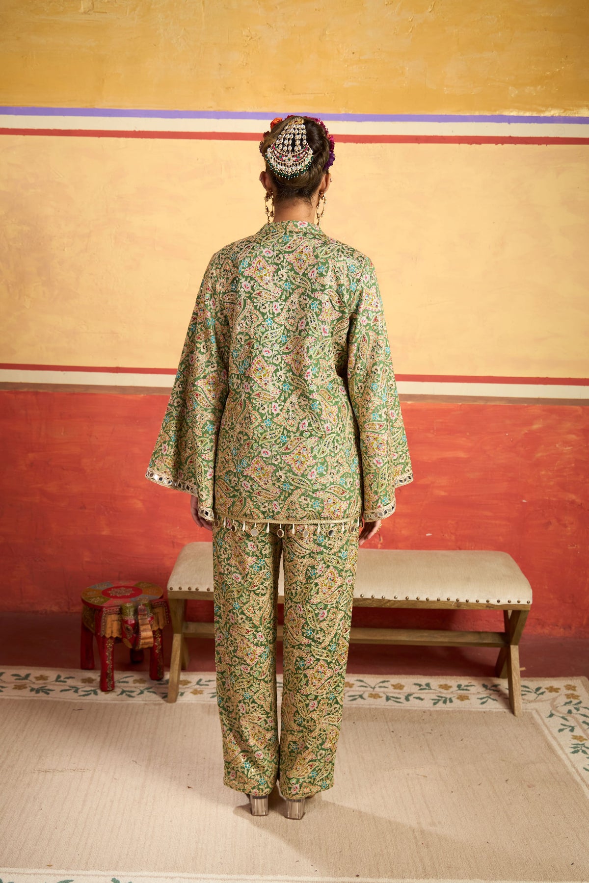 Step into a painting brought to life with this lush green co-ord, blooming with delicate florals and timeless charm. The longline kurta with flared sleeves and dainty button detailing exudes relaxed sophistication, while the straight-fit trousers keep it modern and easy. The playful lace tassel hem adds a touch of whimsy that moves with you.