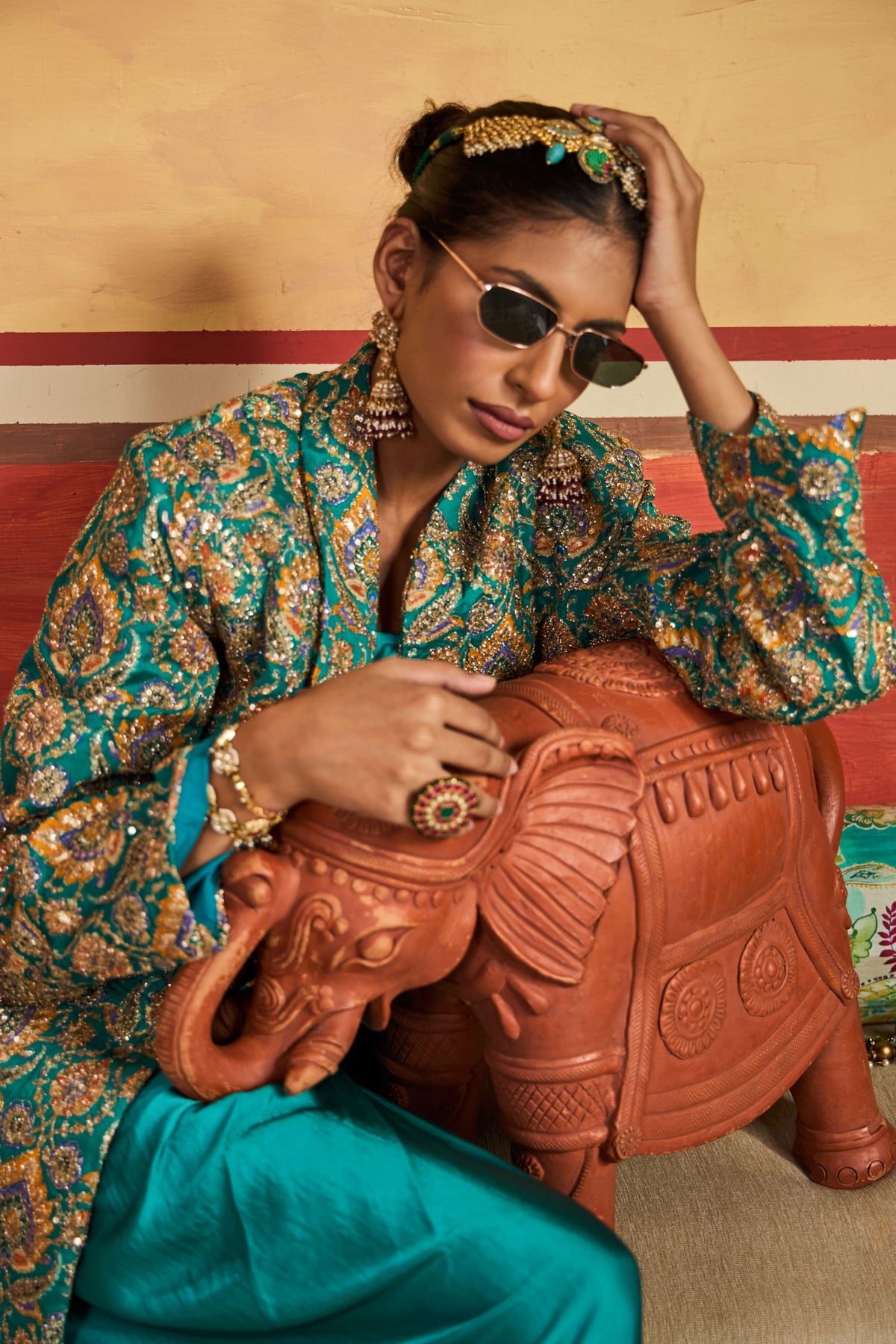 A modern fairytale spun in teal silk – this ensemble is where tradition takes a bold, contemporary turn. The fluid drape skirt and bandeau blouse whisper effortless glamour, while the intricately embroidered jacket brings in an old-world charm with a royal twist. Paired with a statement potli and luxe accents, it’s a look that says “queen of the soirée” without trying too hard.