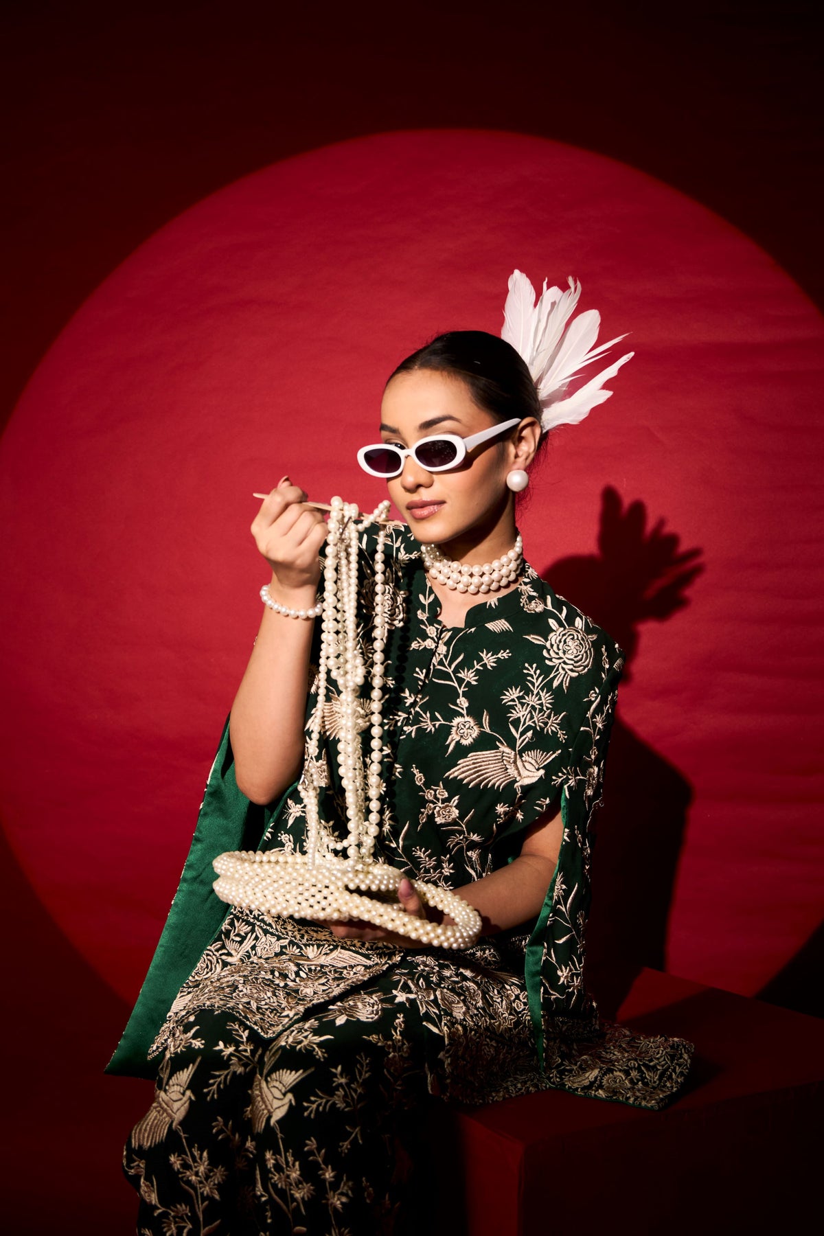 Reyna Gara Glazed Cape Jacket With Coordinated Pants- Green