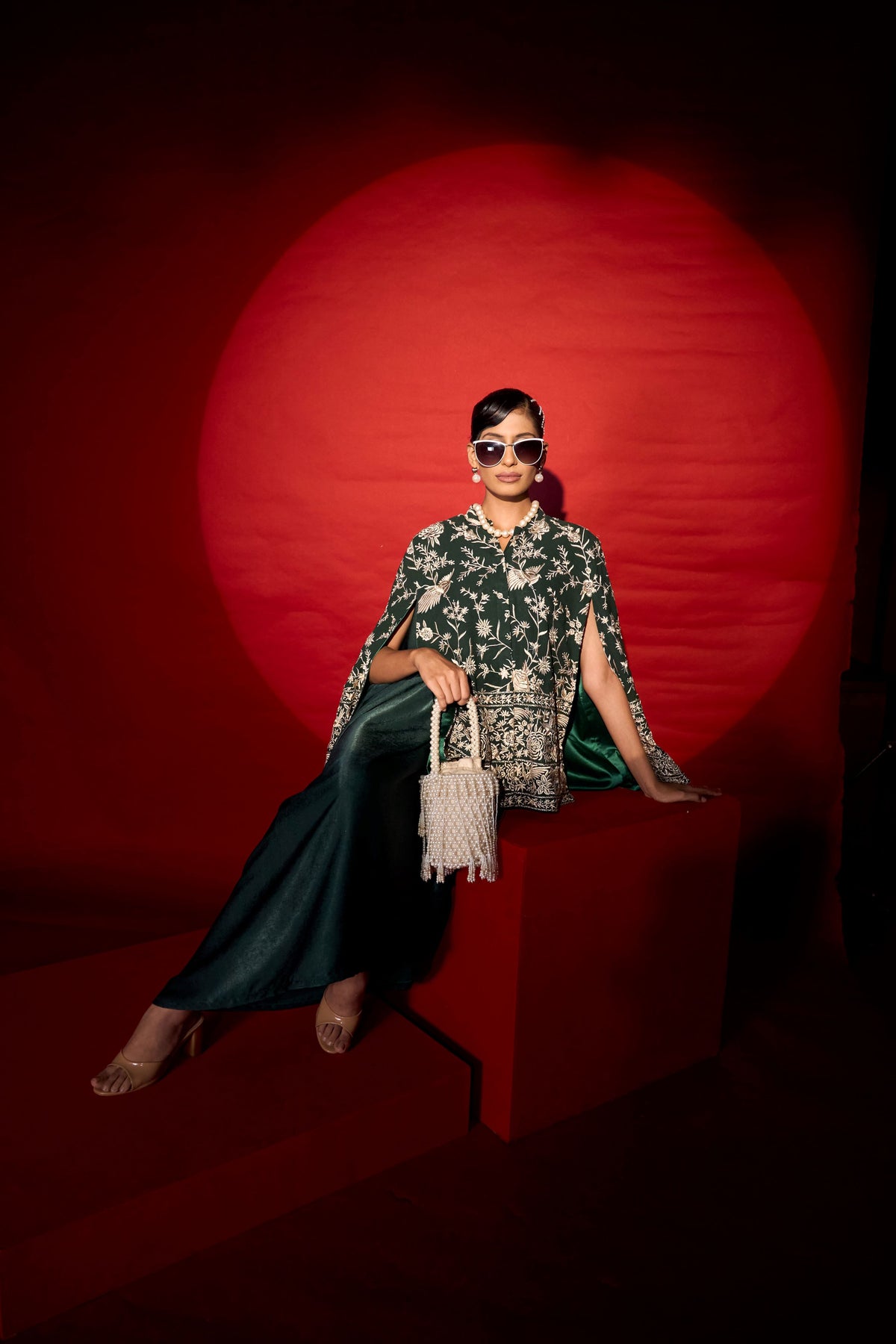 Fabricated on a Thick Georgette Fabric, the TSV's Reyna Gara Glazed Cape Jacket With Slip Easy Dress in colour Green is designed with typical Gara embroidery, featuring intricate patterns and motifs which is slowly becoming rare. We have come up with a new Gara glaze collection to enhance the craftmanship. Cape Jacket gives an elegance, versatility, and adds a difference from the old traditional to the new era of Gara made with different cuts which gives more detail to the set. The Jacket is paired with our statement Slip easy Dress, which is made from a rich Satin fabric.