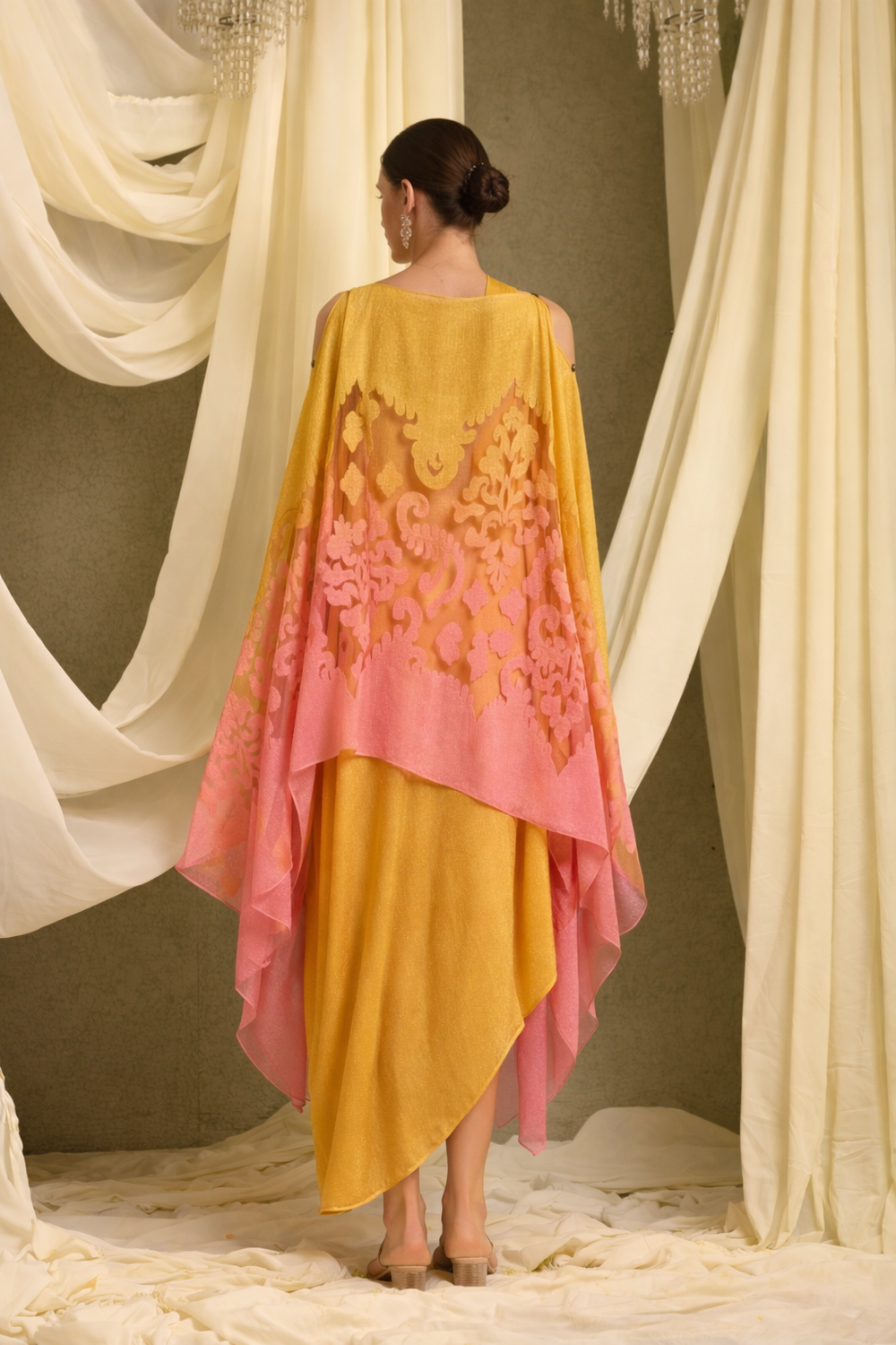 SLIP EASY WITH ORGANZA CAPE-MUSTARD WITH CORAL PINK