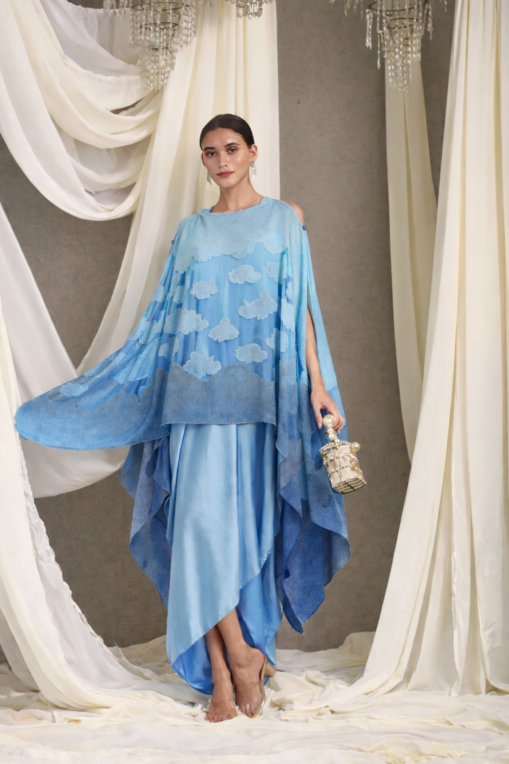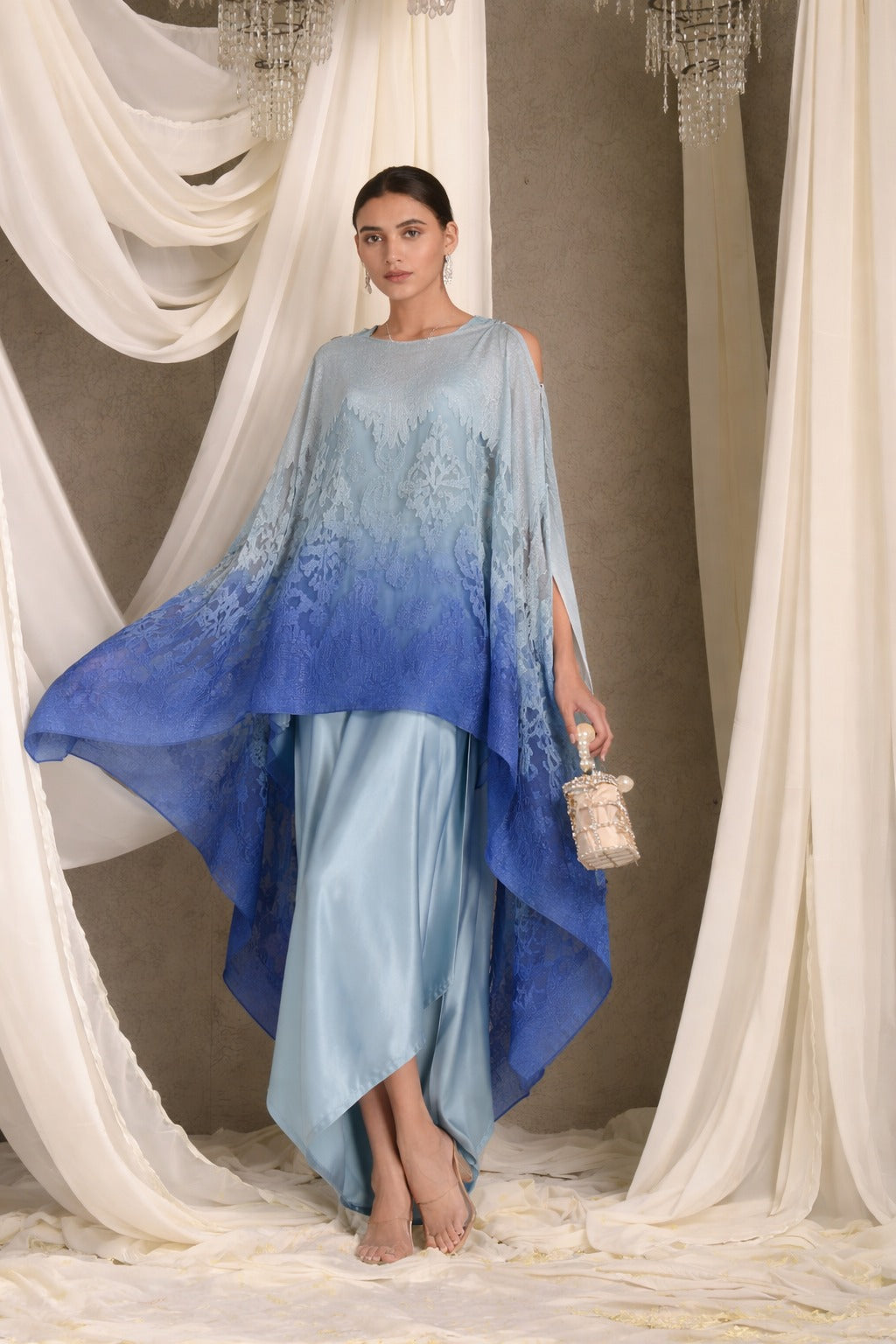 SLIP EASY DRESS WITH ORGANZA CAPE- SKY BLUE OMBRE