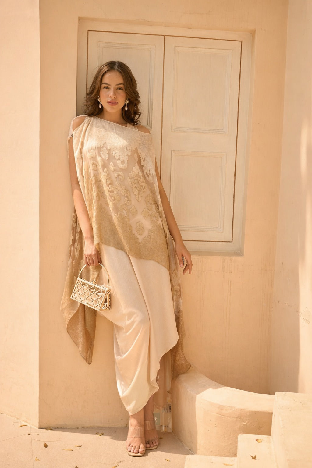 Divine Sequins Embroidered Cape Co-ordinated with Pants - Nude