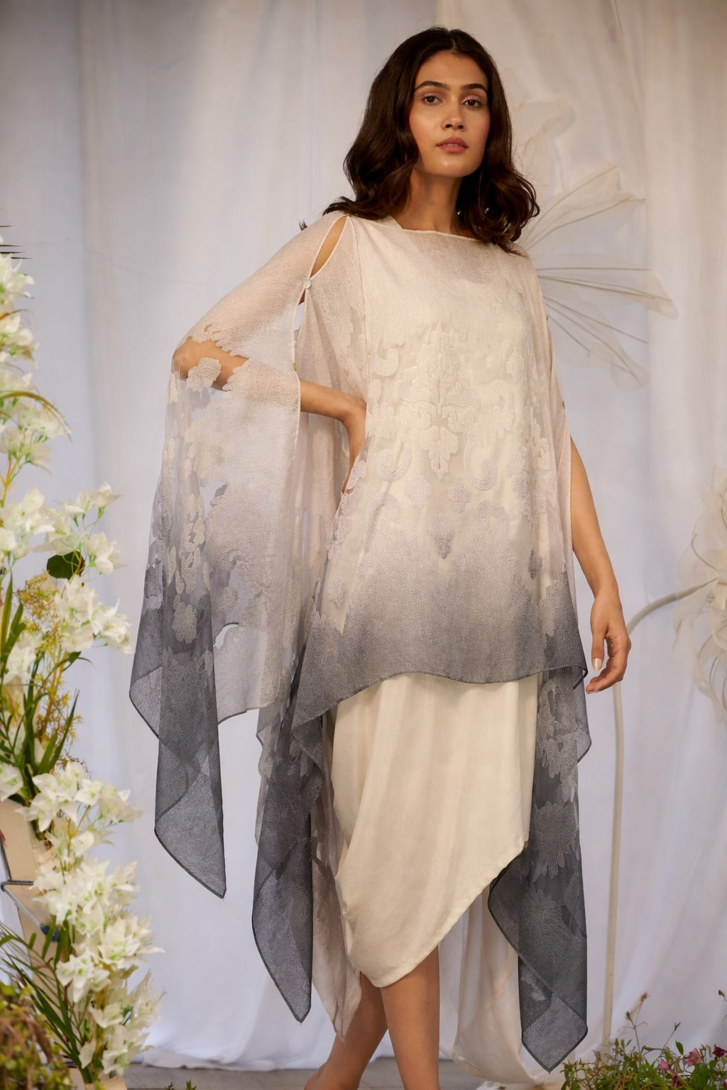 SLIP EASY WITH ORGANZA CAPE -IVORY WITH GREY OMBRE
