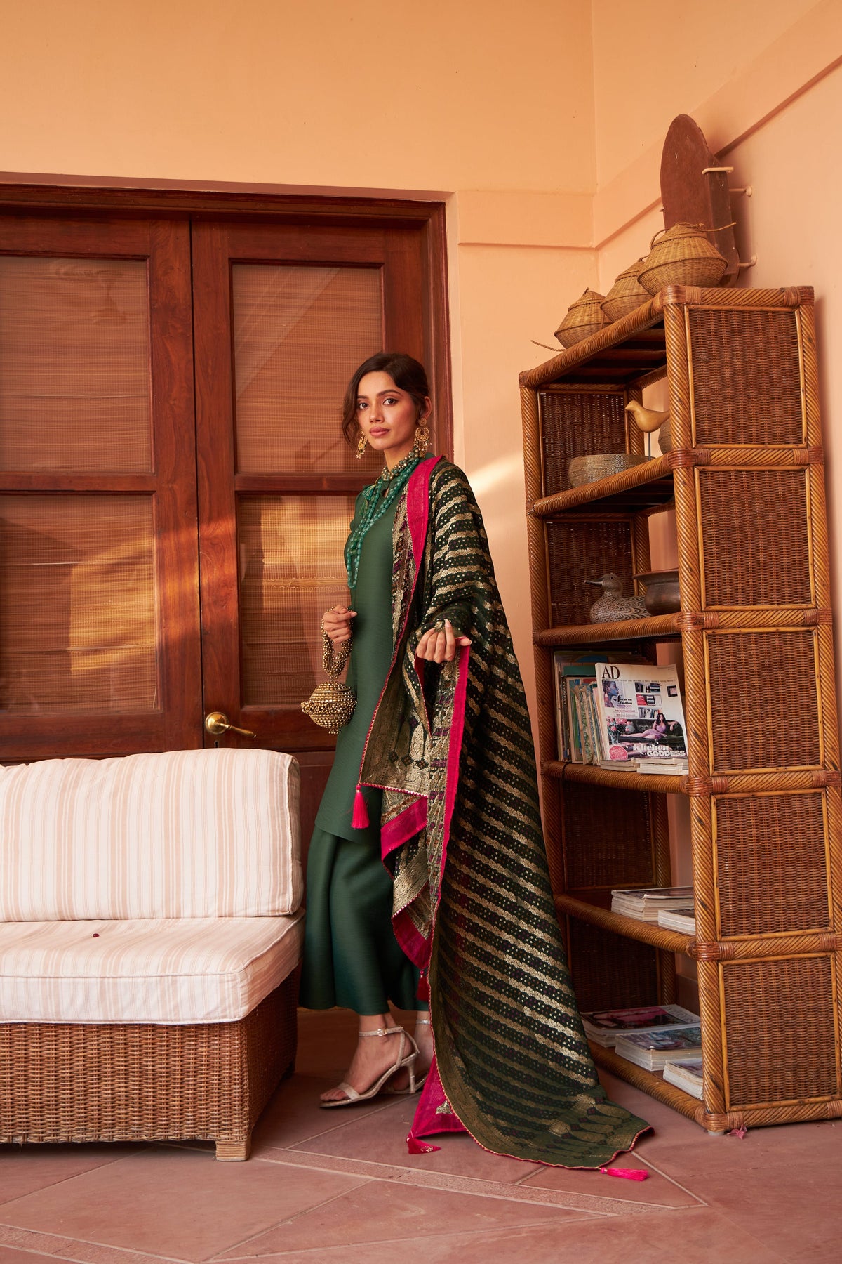 Elevate your style quotient with our Myra Mandarin Kurta with Culotte Pants paired with a resplendent Bandhani Brocade Dupatta in color Emerald Green. Crafted on a micro pleated fabric the tunic and the Culottes are the masterpieces that fuses modernity with timeless elegance. Complementing the Pleated Tunic set is the magnificent Bandhani Brocade Dupatta, a true embodiment of opulence. The dupatta is woven with luxurious brocade patterns in lustrous gold and silver threads, creating a mesmerizing interplay of shimmer and texture. The Bandhani tie-dye technique adds an element of traditional charm, with intricate patterns dyed onto the fabric by skilled artisans.