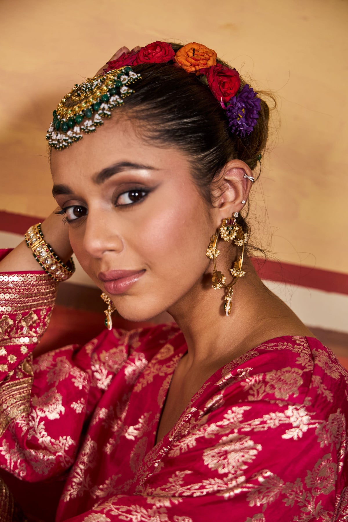 The Banarasi Begum Tunic Set in Green and Purple is a stunning fusion of tradition and modernity. The rich Banarasi Pant , paired with a flowing Kurta, boasts intricate weaving in vibrant shades of pink and purple, making it perfect for festive occasions. This set exudes royal charm with a contemporary flair, ideal for those who want to stand out with elegance and grace.
