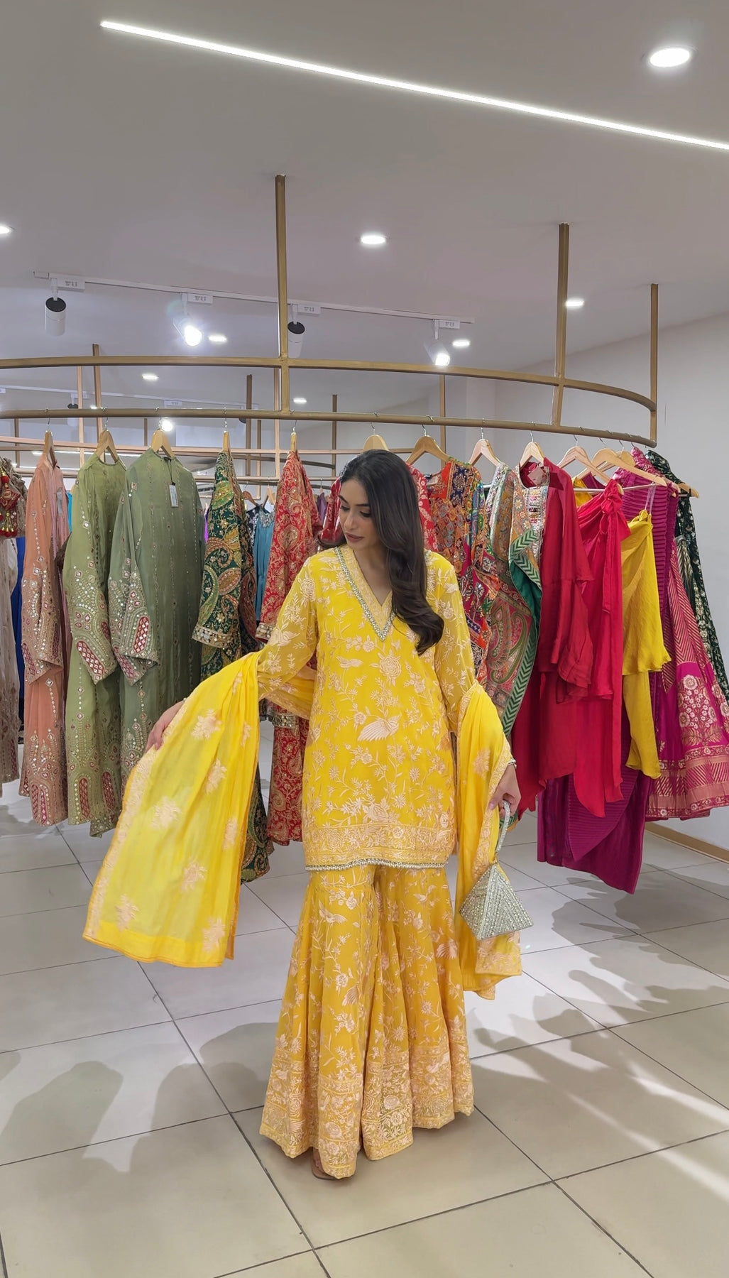 Delicate and dreamy, the Sharara Set is a celebration of intricate craftsmanship. Rendered in a soft ivory hue, this set features all-over tonal thread embroidery in floral and vine motifs that exude subtle elegance. The hemline and cuffs are highlighted with pops of ivory floral accents, adding a romantic touch. Paired with matching embroidered straight pants, this look is effortless yet elevated.