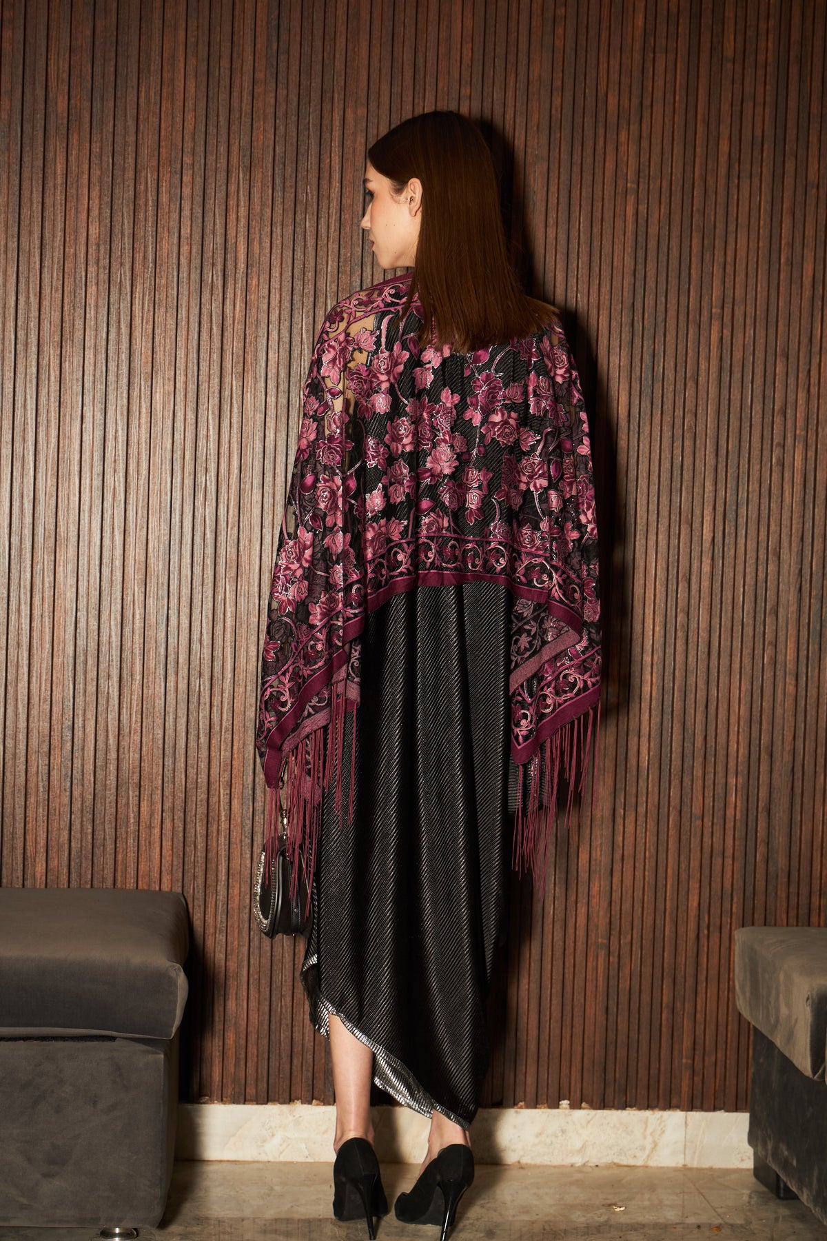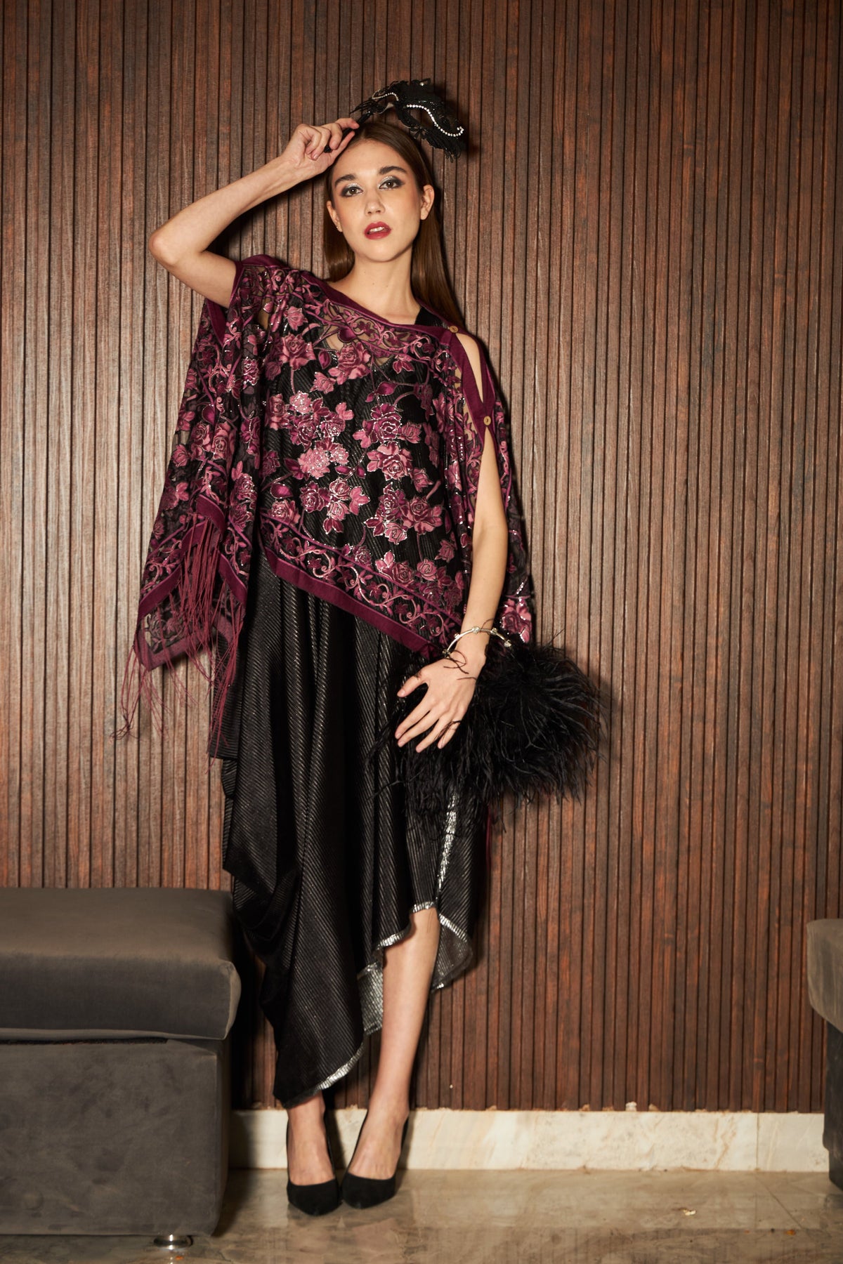 Elegant and fanciable, this two piece outfit featuring a slip easy dress in Velvet fabric and a rich cut Floral Fringe cape with button detailings on the sleeve is surely gonna make you try this outfit and add it to your wardrobe.