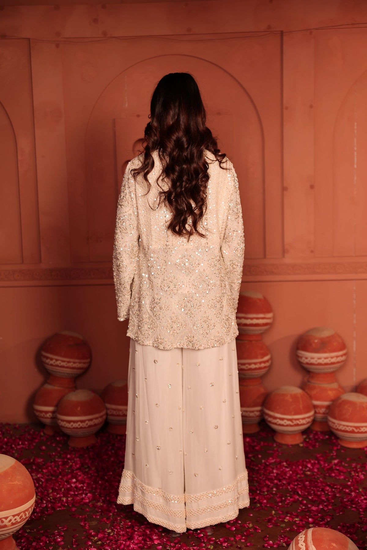 Elevate your ethnic wardrobe with this exquisite Inaari White embroidered Sharara set, crafted from luxurious georgette fabric. The delicate cutdana embroidery adorns the ensemble with intricate detailing, creating a sophisticated silhouette perfect for weddings, celebrations, and special occasions. The breathable georgette ensures comfort throughout wear, while the ornate embellishments add timeless elegance. This versatile piece seamlessly transitions from festive gatherings to formal events, offering both style and grace.