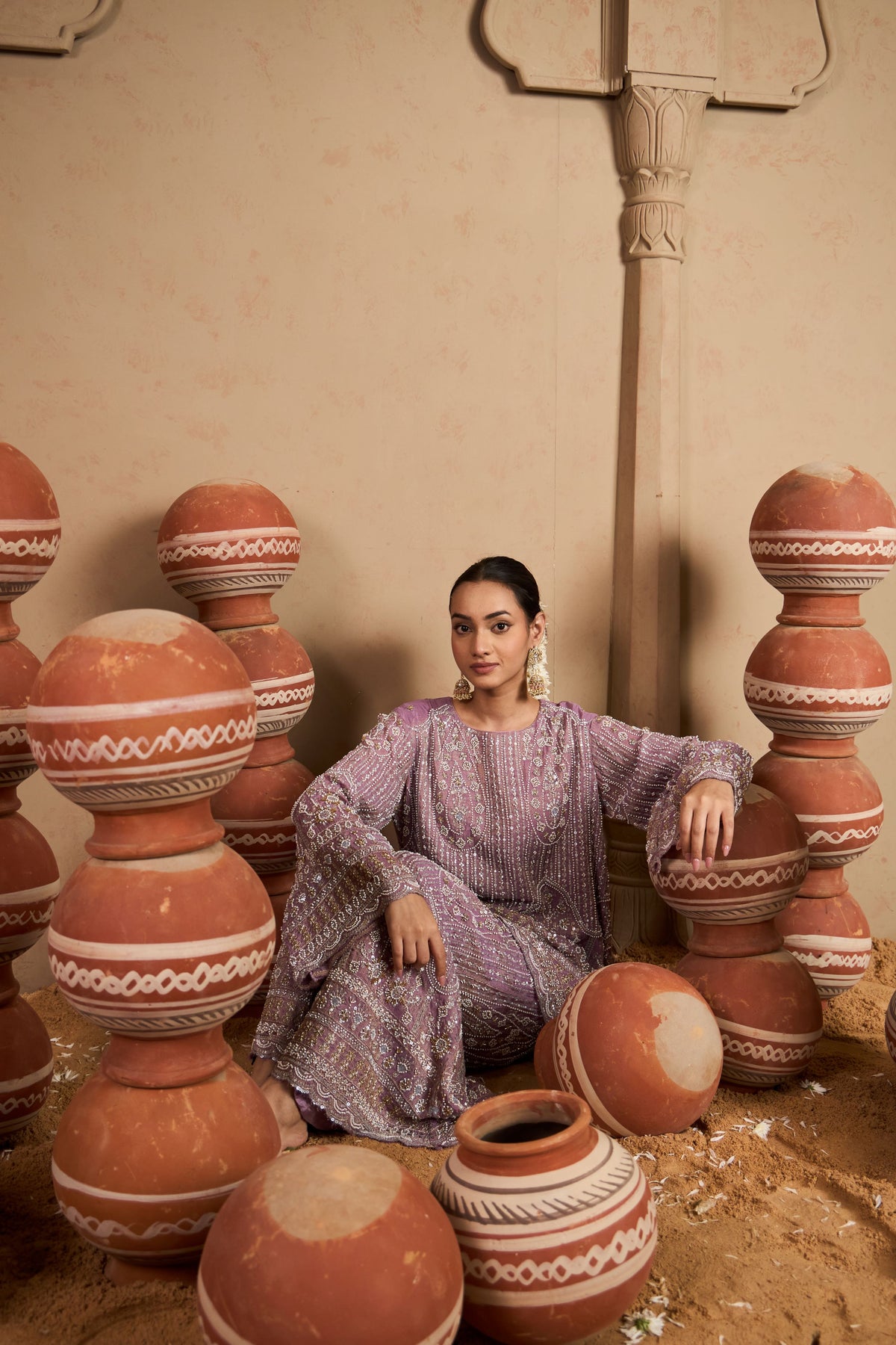 Elevate your ethnic wardrobe with this exquisite Lavender embroidered Sharara set, crafted from luxurious Tissue fabric. The delicate cutdaana embroidery adorns the ensemble with intricate detailing, creating a sophisticated silhouette perfect for weddings, celebrations, and special occasions. The breathable tissue ensures comfort throughout wear, while the ornate embellishments add timeless elegance. This versatile piece seamlessly transitions from festive gatherings to formal events, offering both style and grace.