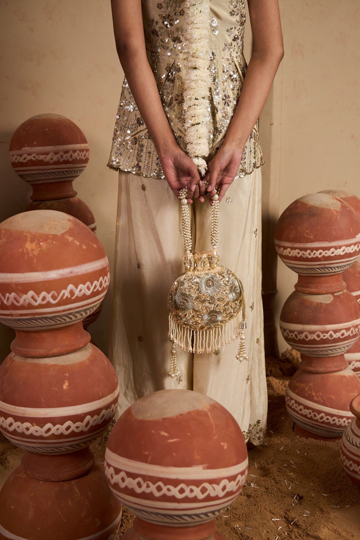 Elevate your ethnic style with the Ivory Embroidered Sharara Set. This stunning ensemble features a beautifully embroidered Kurta adorned with cutdaana work, creating a rich and sophisticated look. The flowy sharara pants add a touch of elegance and movement, making it perfect for festive occasions or celebrations. Embrace the beauty of this exquisite outfit.