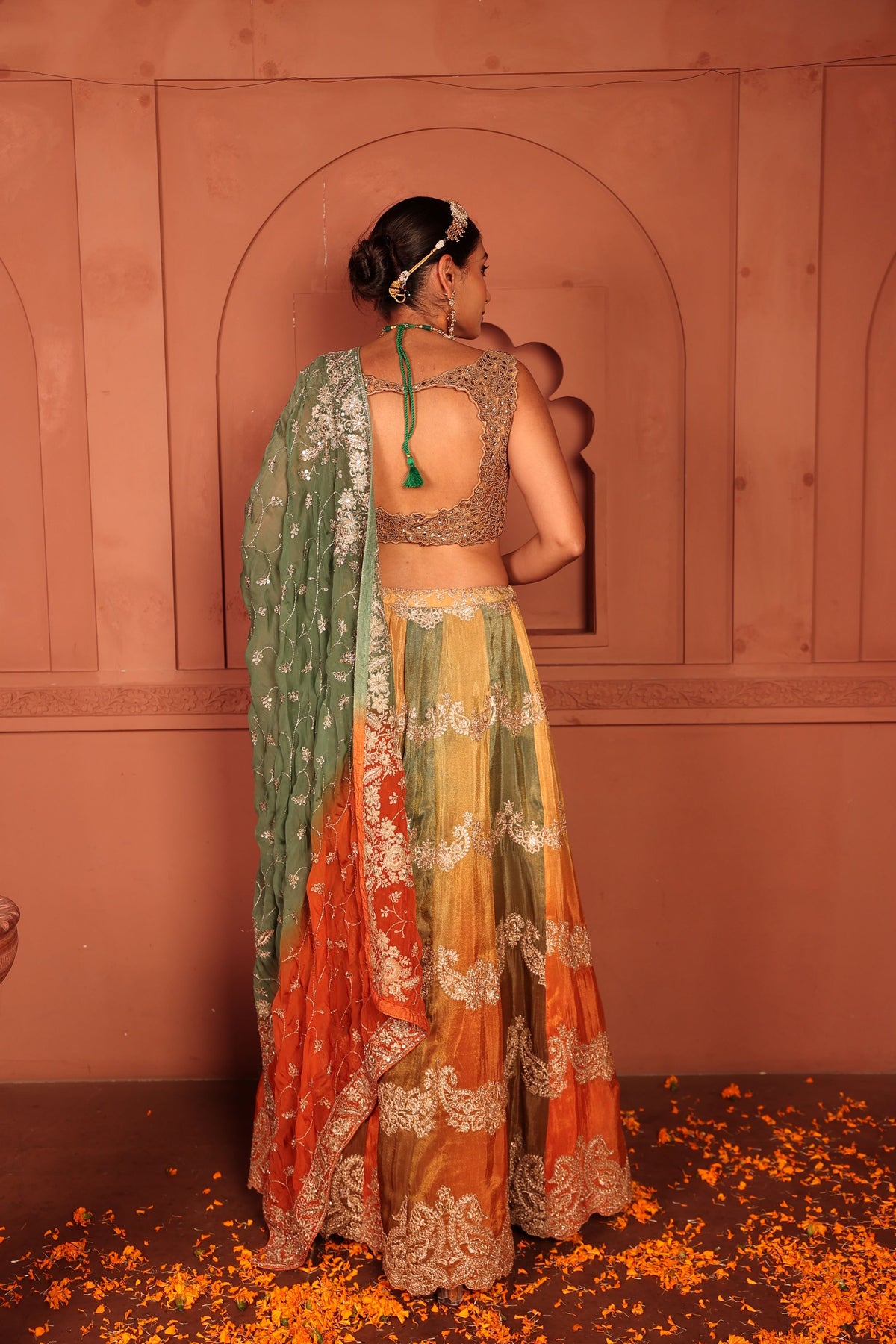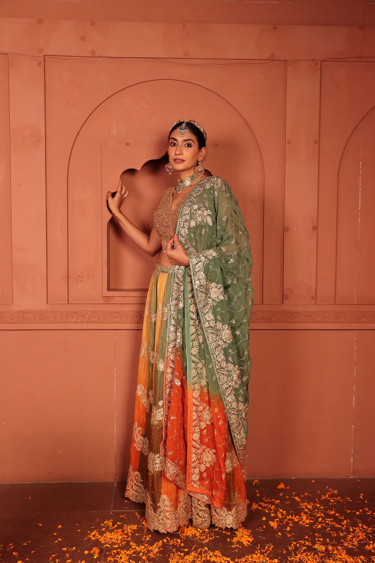 A matching dupatta with scalloped embroidered edges completes the ensemble, making it perfect for weddings, sangeet soirées, receptions and grand festive celebrations.