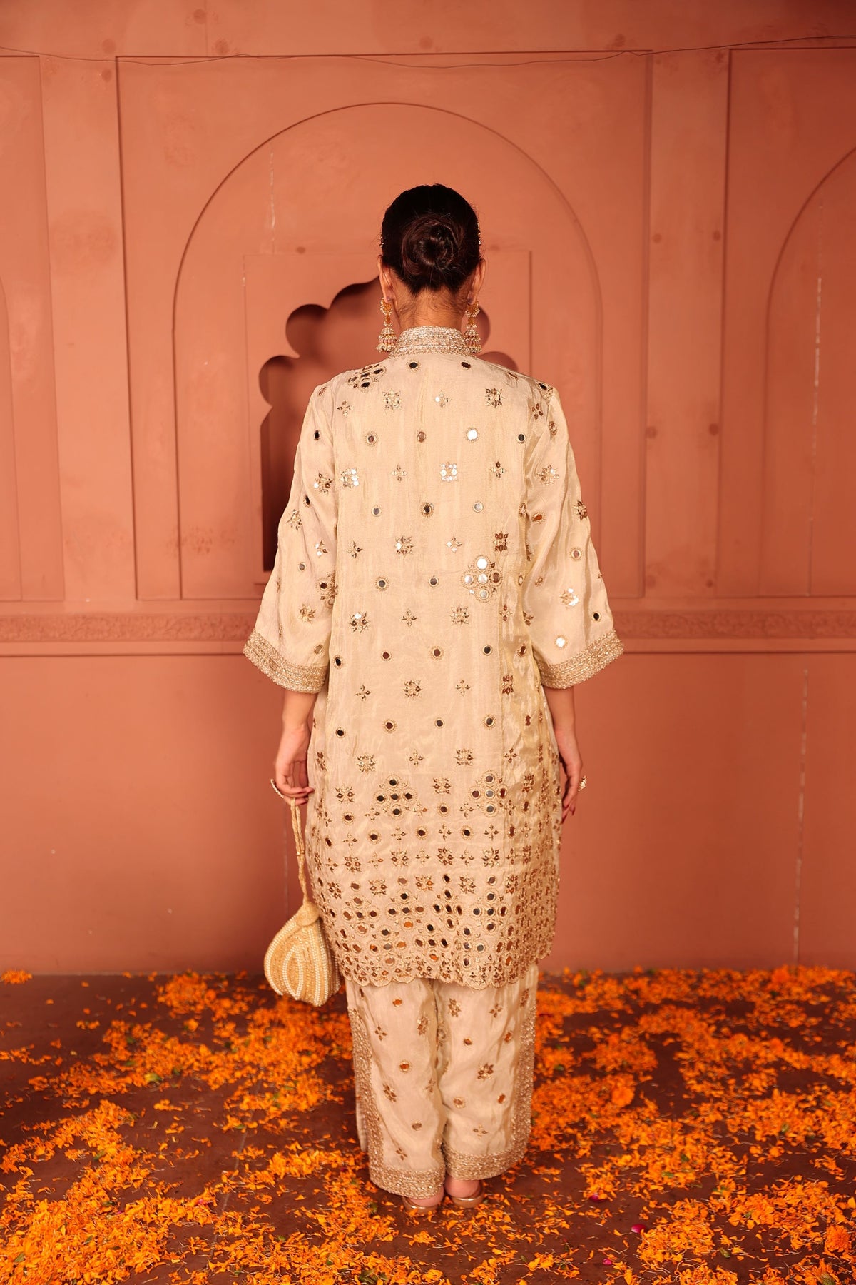 Elegant, festive and beautifully detailed — the Aaina Adaa Tunic Set with Embroidered Pants - Ivory features exquisite mirrorwork, delicate zari embroidery and scalloped craftsmanship on a soft champagne base. The straight-fit kurta adds a regal charm with its ornate neckline, while the embellished pants complete the look with luxe finesse.