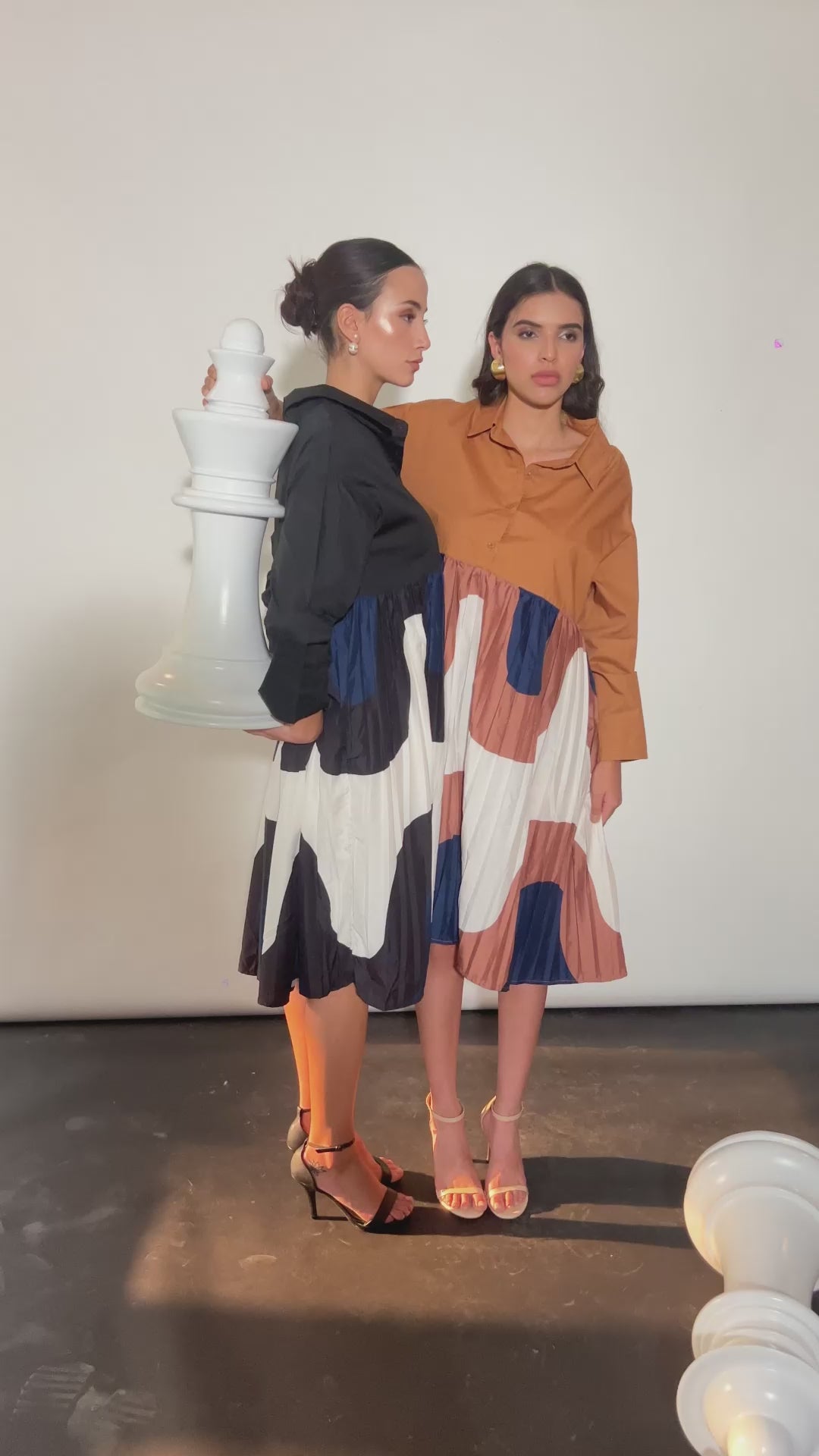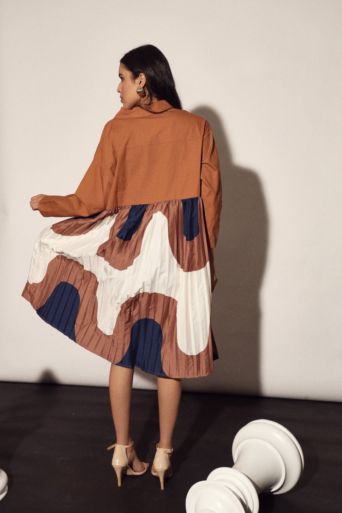 A bold yet breezy expression of effortless style, this shirt dress blends structure and fluidity with its crisp terracotta poplin bodice and pleated, multi-hued abstract skirt. The button-down collar lends a tailored touch, while the relaxed silhouette makes it perfect for easy, all-day wear. A modern art-inspired palette of rust, navy, and ivory adds an artistic twist, making it a standout addition to your wardrobe.