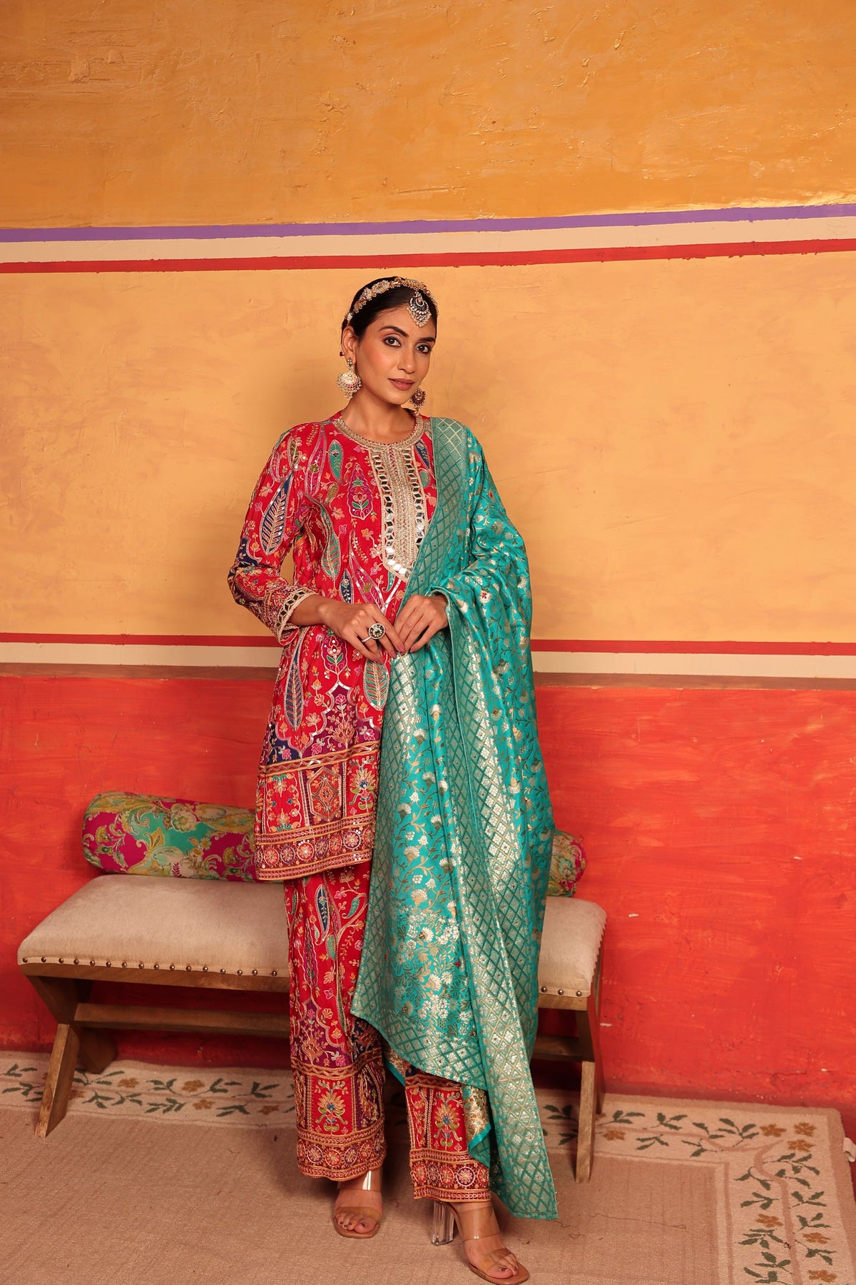 This stunning three-piece set features a richly detailed red kurta and matching pants adorned with intricate embroidered motifs, mirror accents, and regal borders. Paired with a contrasting turquoise Banarasi dupatta, the look blends tradition with contemporary flair. Perfect for weddings, mehendi functions, and grand celebrations — this outfit brings colour, charm, and timeless elegance to your wardrobe.