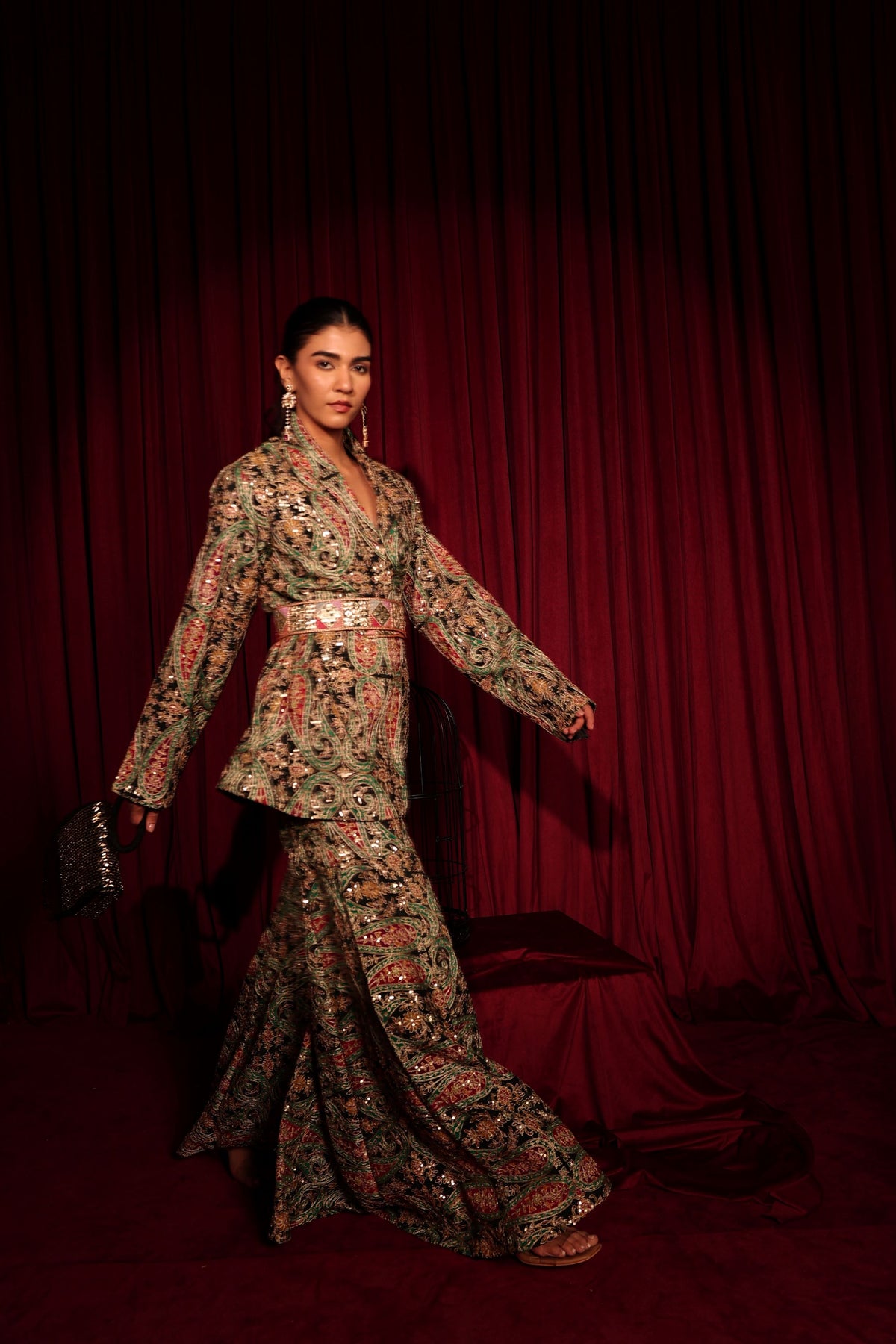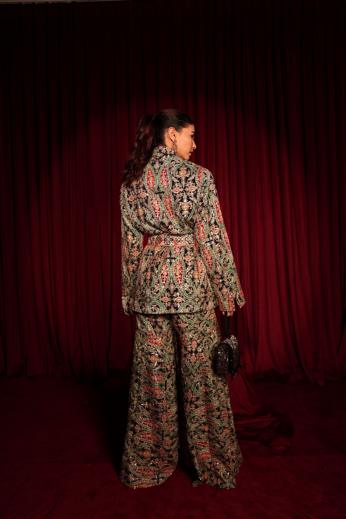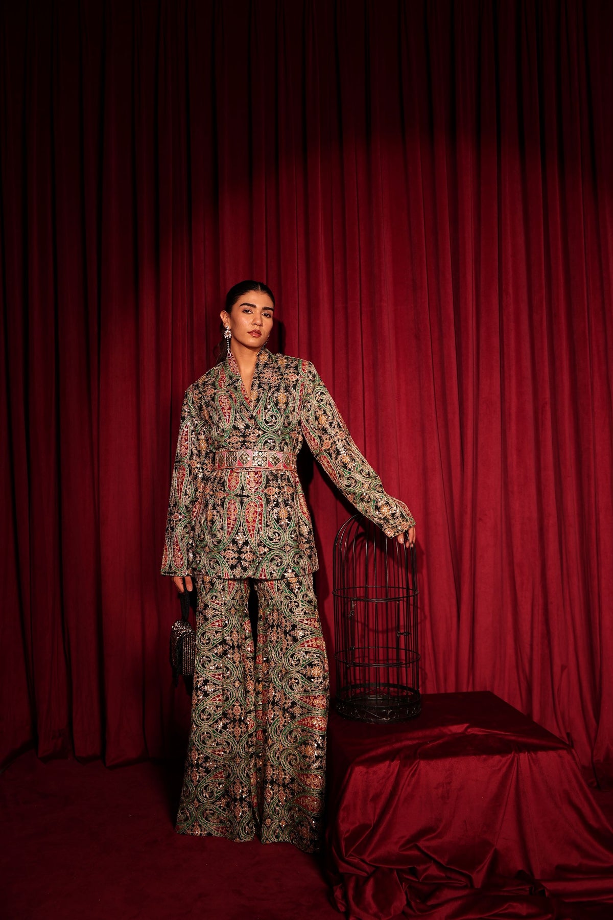 The  Elizey Paisley Embroidered Colorful Power Suit with Belt - Black is adorned with intricate multicolour embroidery, featuring paisley and heritage motifs that shimmer beautifully. Paired with coordinated wide-leg embroidered pants, the silhouette is powerful, luxurious, and undeniably statement-making — perfect for cocktail nights, receptions, and modern festive soirées.