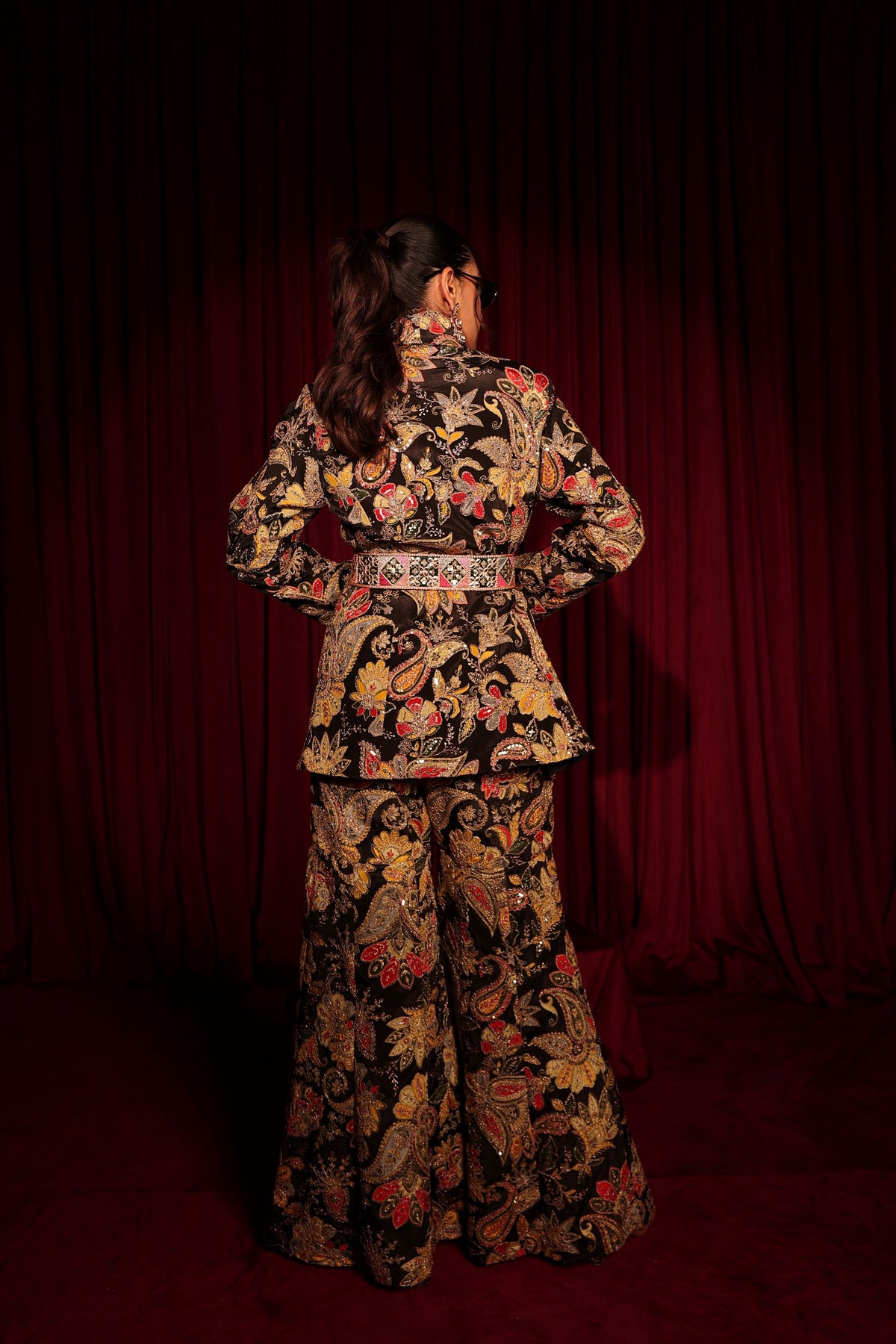The Elizey Paisley Embroidered Power Suit with Belt - Black  features rich multicolour paisley motifs with sequin and thread detailing, paired with dramatic wide-leg pants for a runway-ready silhouette. Striking, confident, and luxurious — perfect for cocktail nights, receptions, and fashion-forward celebrations.
