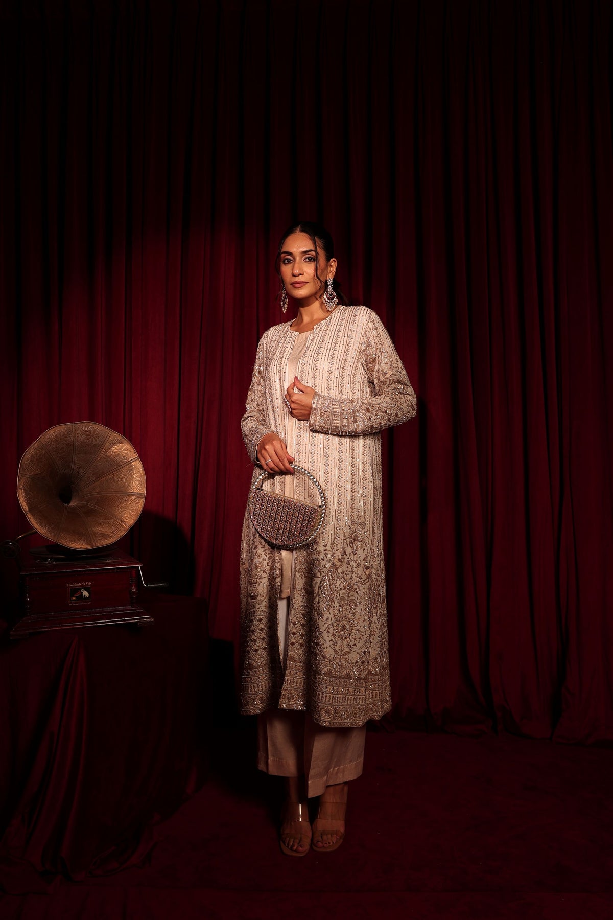 MW Inaaya Embroidered Long Jacket With Bustier and Skirt - Ivory Gold